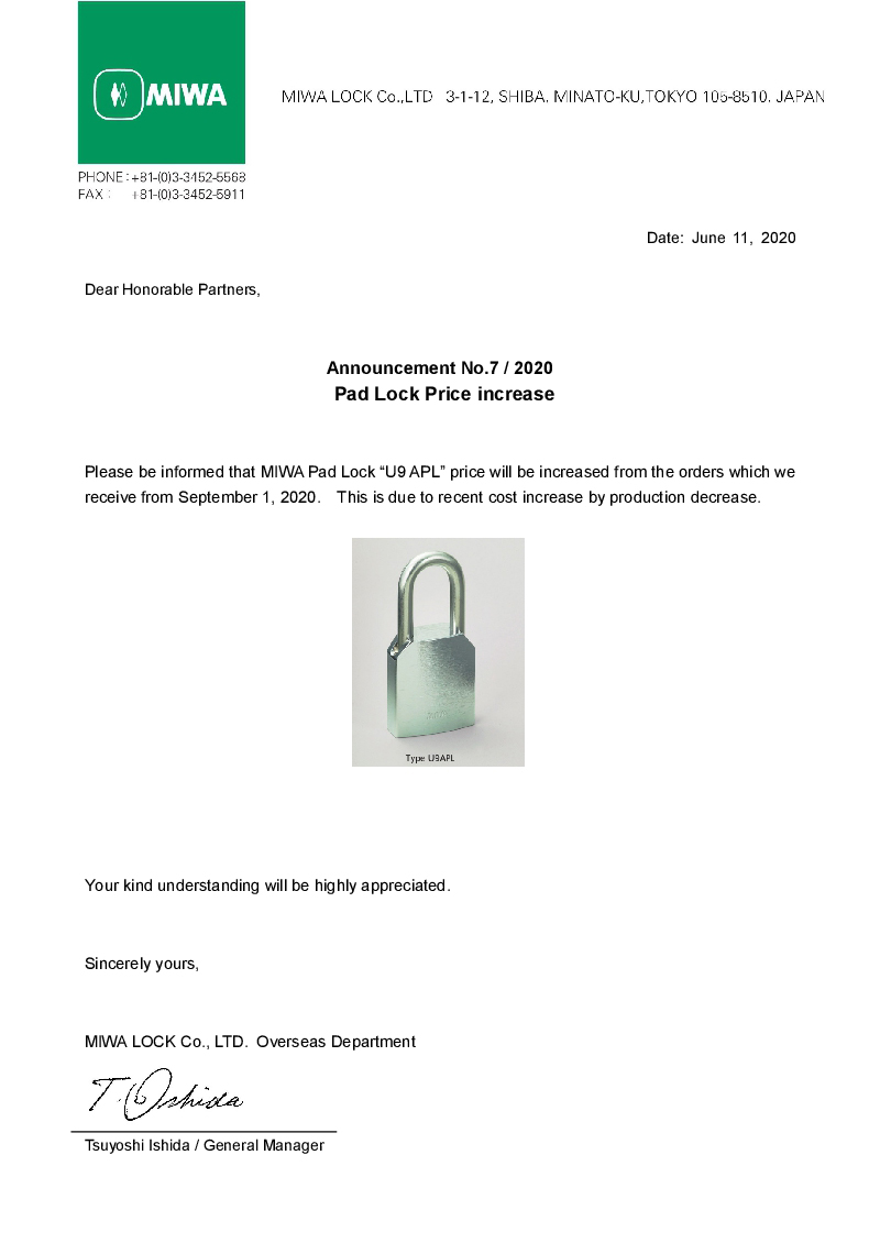 MIWA金庫鎖調(diào)整通知